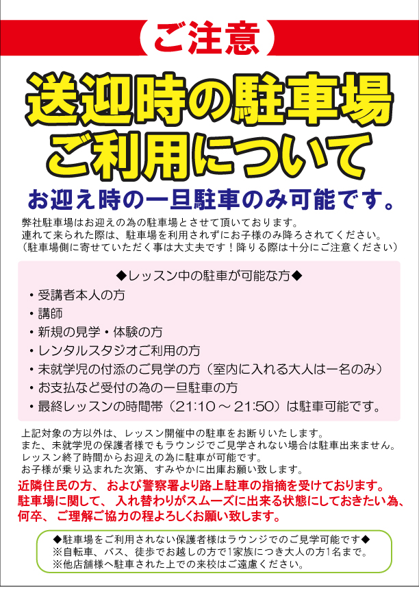 また、”駐車が可能な方”も、受講中の駐車は可能ですが、受講レッスンが終わりましたら速やかに出庫ください。